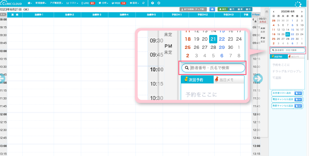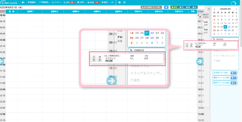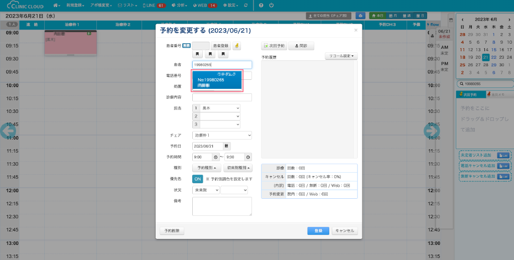 初診時の予約に患者番号の紐付けがされていないと、次回予約の際に初診予約が紐付かず初診の情報を引き出すことが難しくなりますのでご注意ください。