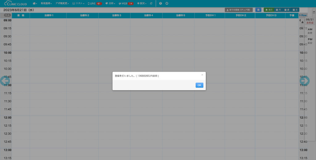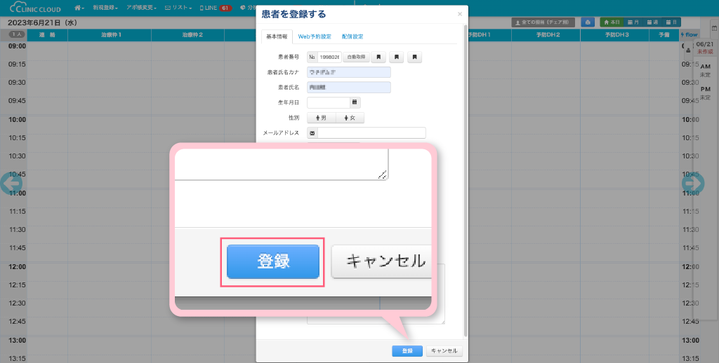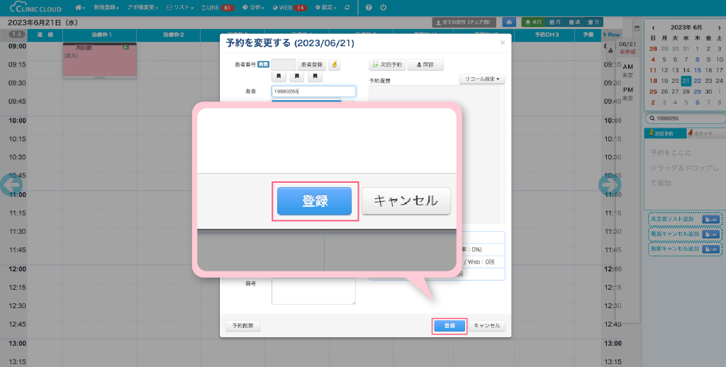 3.「登録」をクリックで予約枠への患者番号の紐付け完了です