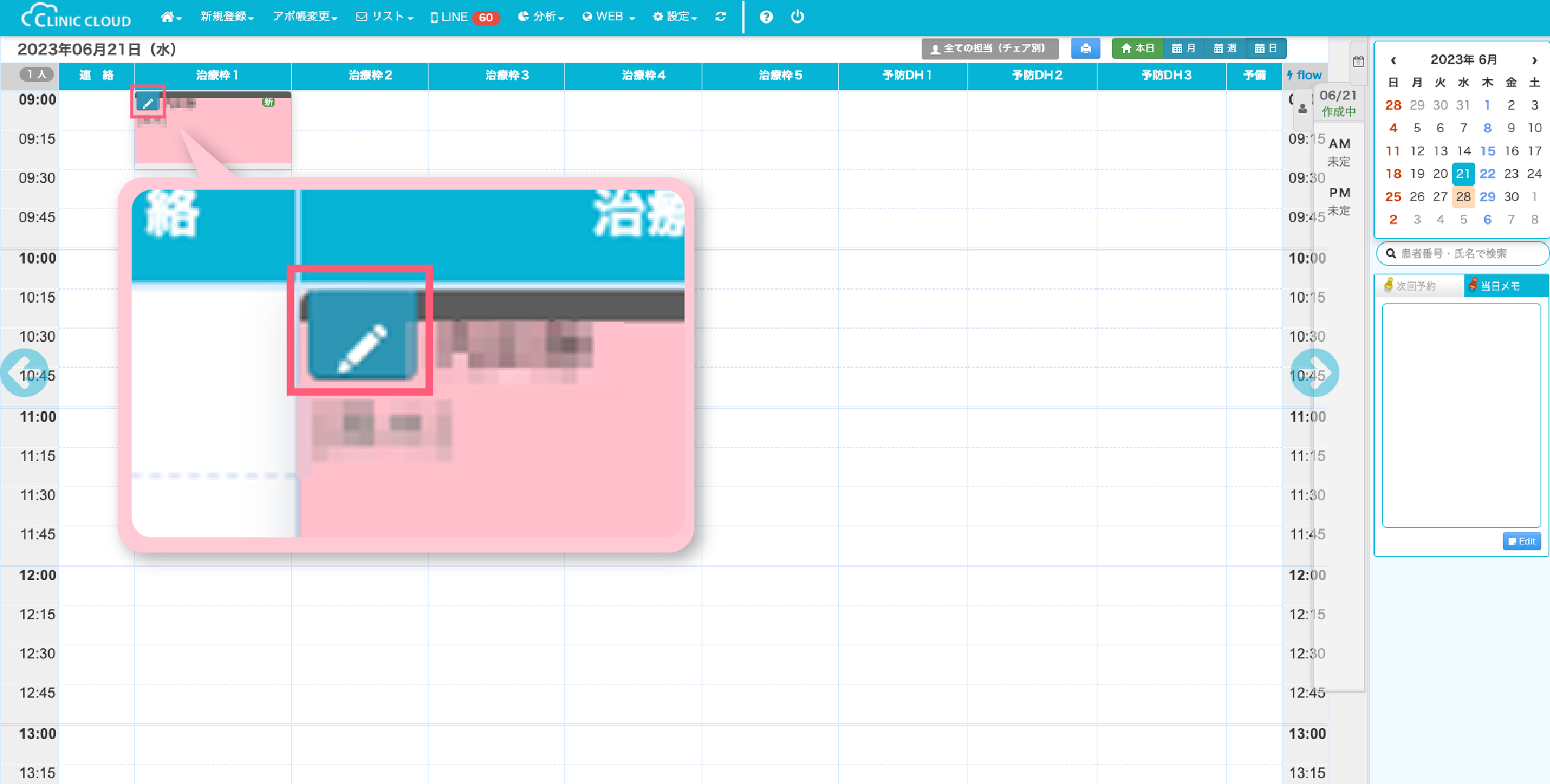 1.初診時の「予約枠」の左上にカーソルを合わせ、「えんぴつマーク」をクリックしてください
