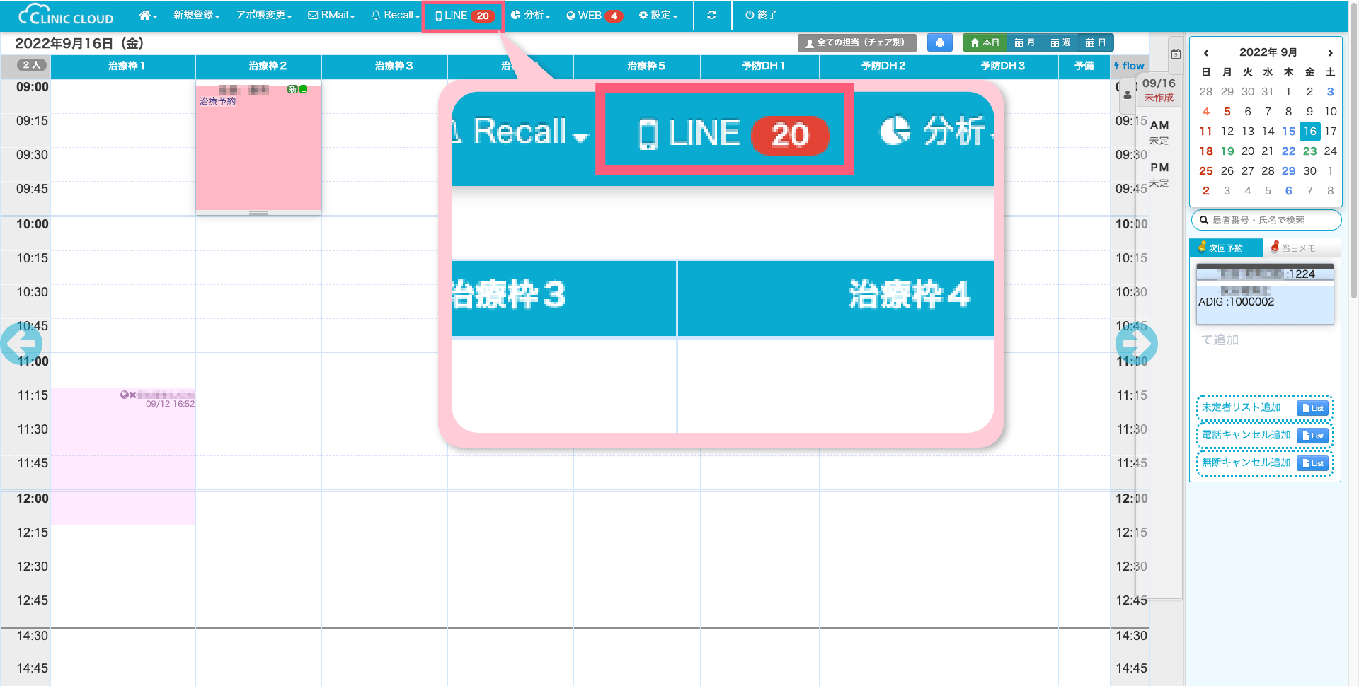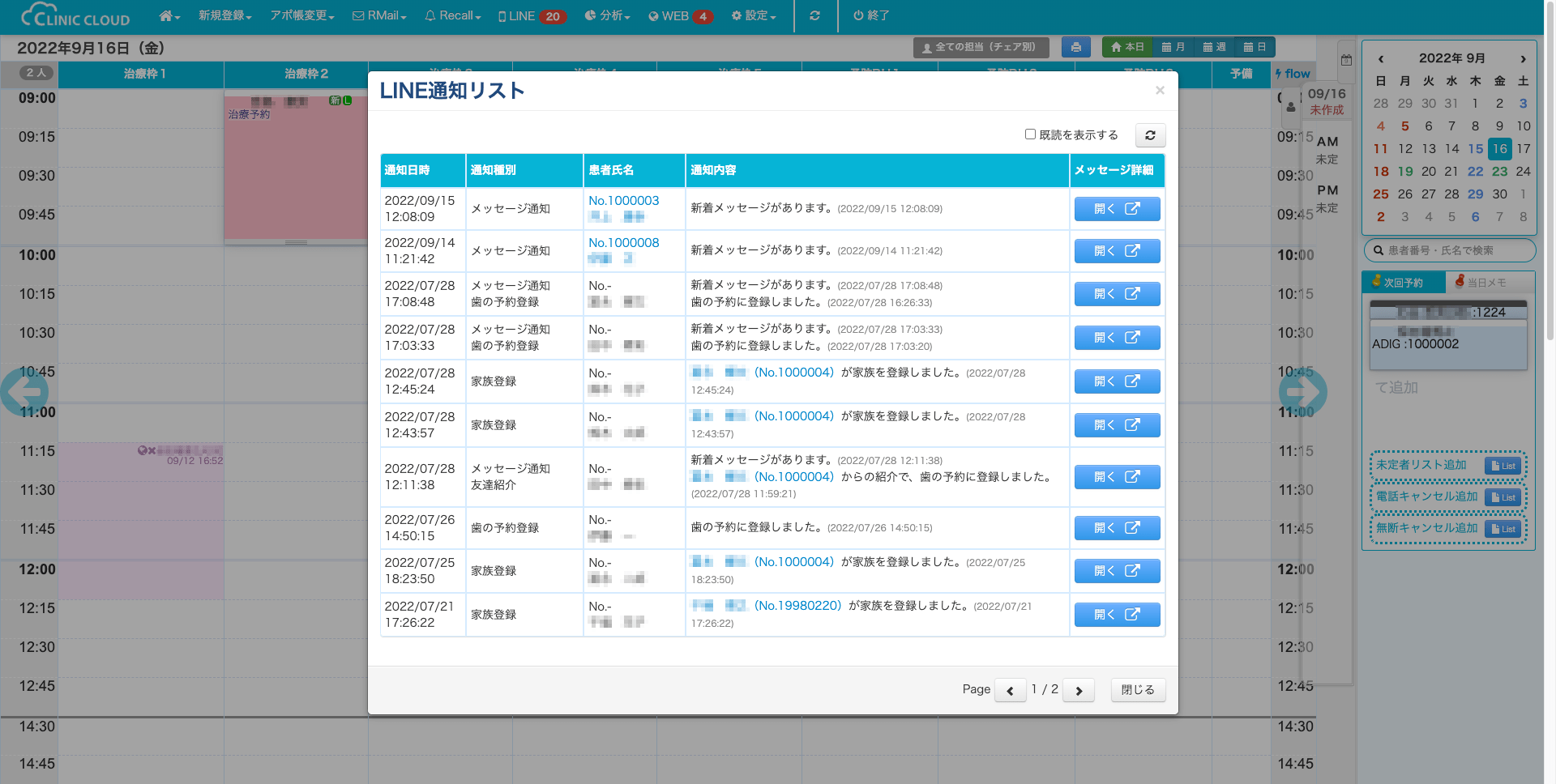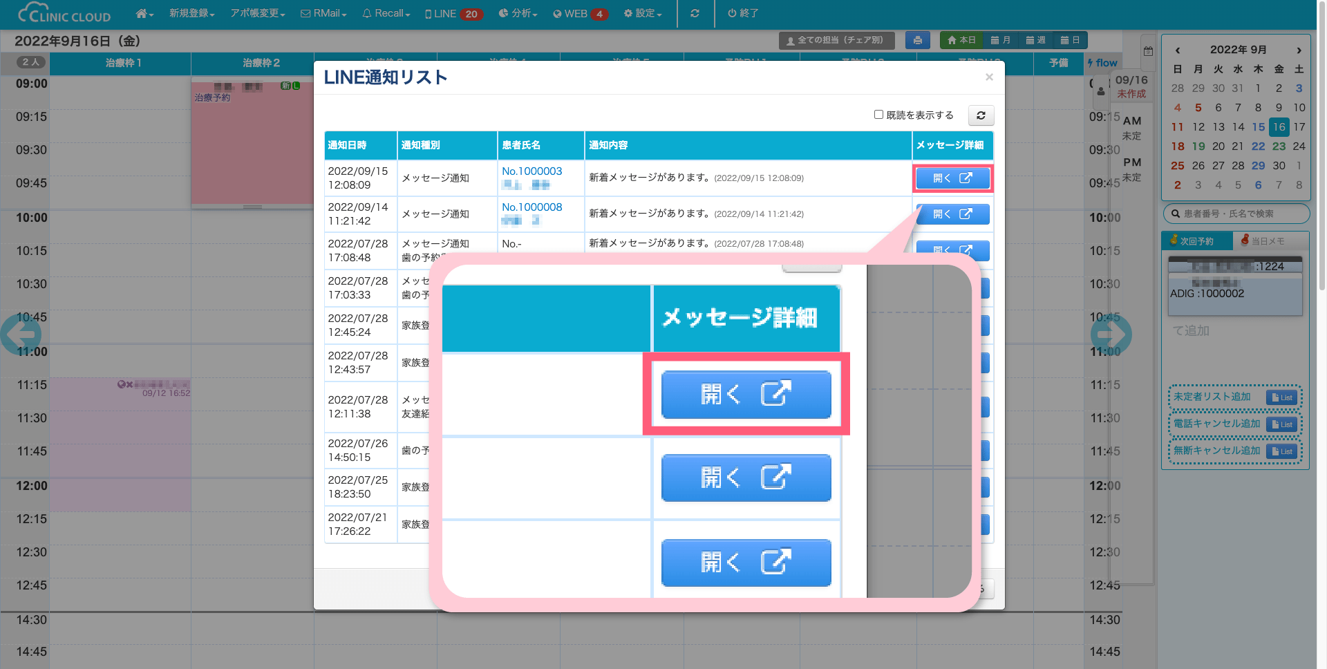 カテゴリー 操作方法 LINE新着機能 メニューバーの「LINE」のアイコンに赤い通知バッジが点灯します。 投稿者 作成者: clinic-cloud-admin 投稿日 2022年9月16日 ABOUT メニューバーの「LINE」のアイコンに赤い通知バッジが点灯します 1.「新規登録」の「新患を登録する」をクリックしてください 2. メニューバーの「LINE」をクリックすると、通知一覧を表示させる事ができます。 3. 詳細を確認したいメッセージの「開く」をクリックするとメッセージを見る事ができます。必要に応じて返信する内容を入力し、送信してください。 ← 友達紹介機能 → オンライン受付機能