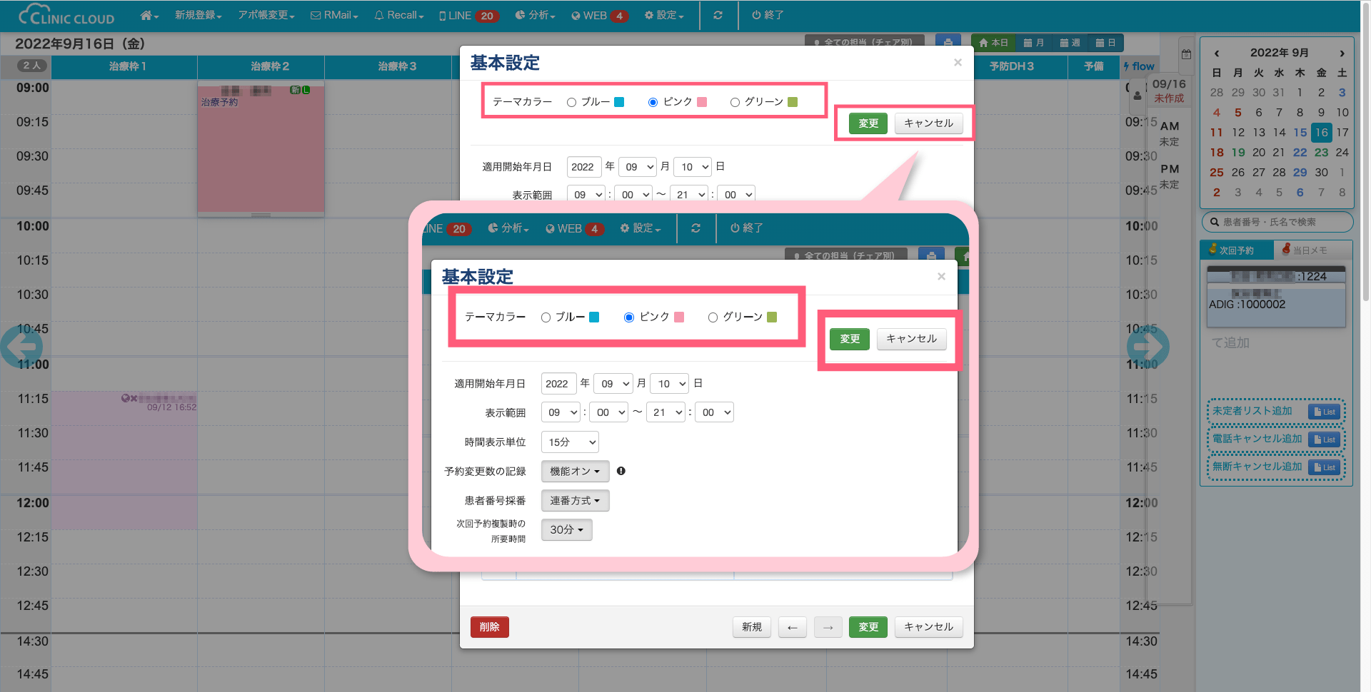 予約一覧画面と患者向けweb予約ページのテーマカラーが変更できるようになりました。