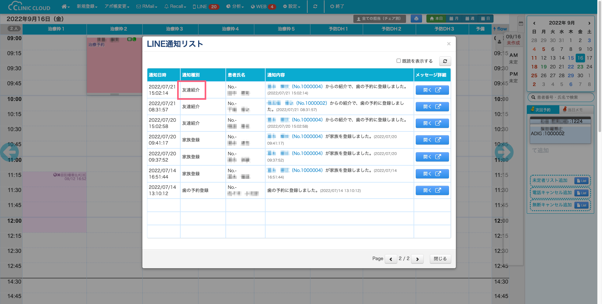 2. 「LINE」をクリックすると、通知リストが表示されます。「友達紹介」を受けた方は通知種別でご確認いただけます。
