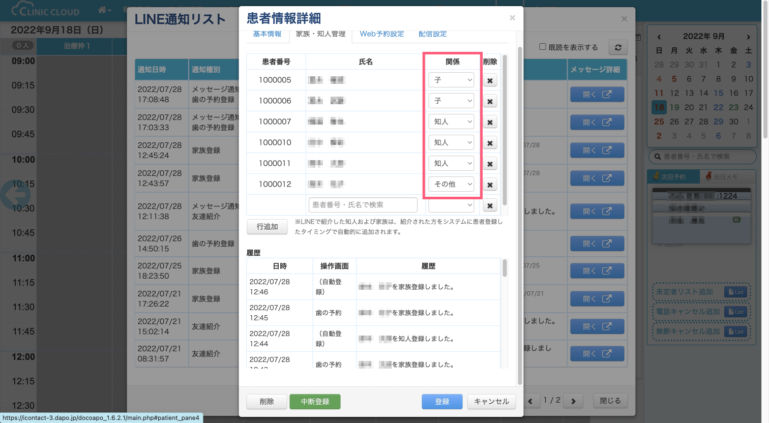 3. 紹介された友人が実際に新患として登録されると、紹介した方と紹介された方の両方の「患者情報詳細:友人知人関係」に自動的に追加されます。