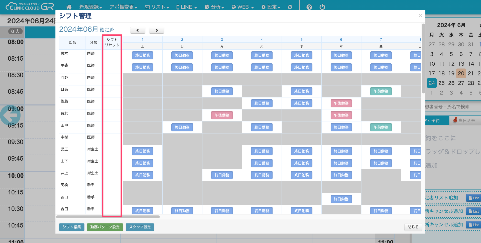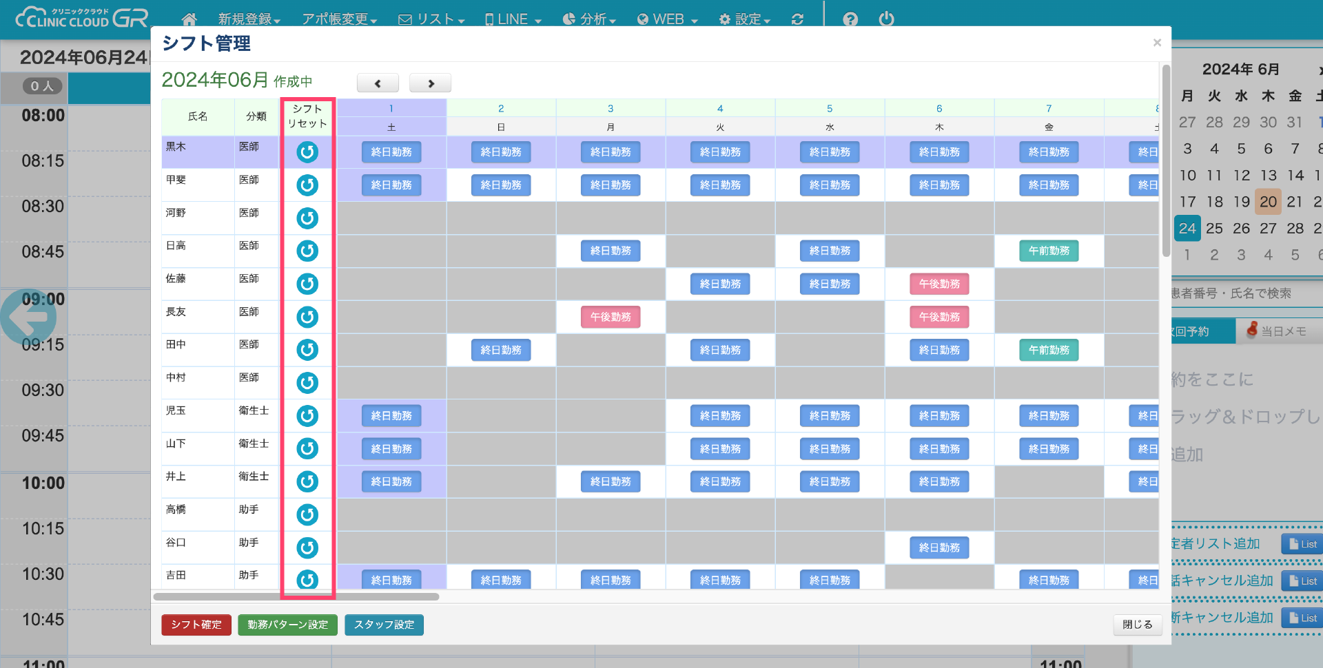 1-1.シフトリセットを押すことで「スタッフ設定」に登録しているシフトパターンにリセットすることができます