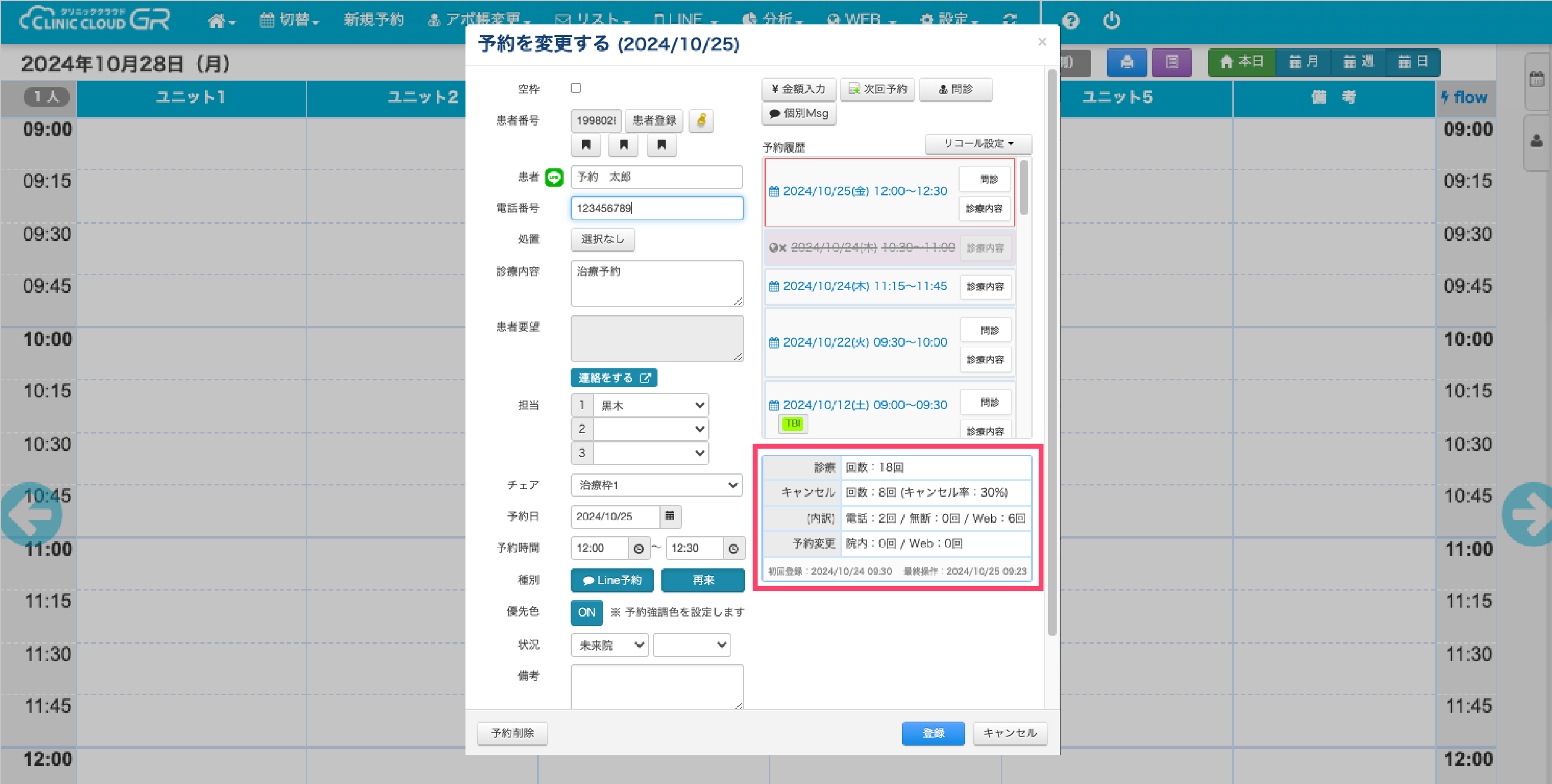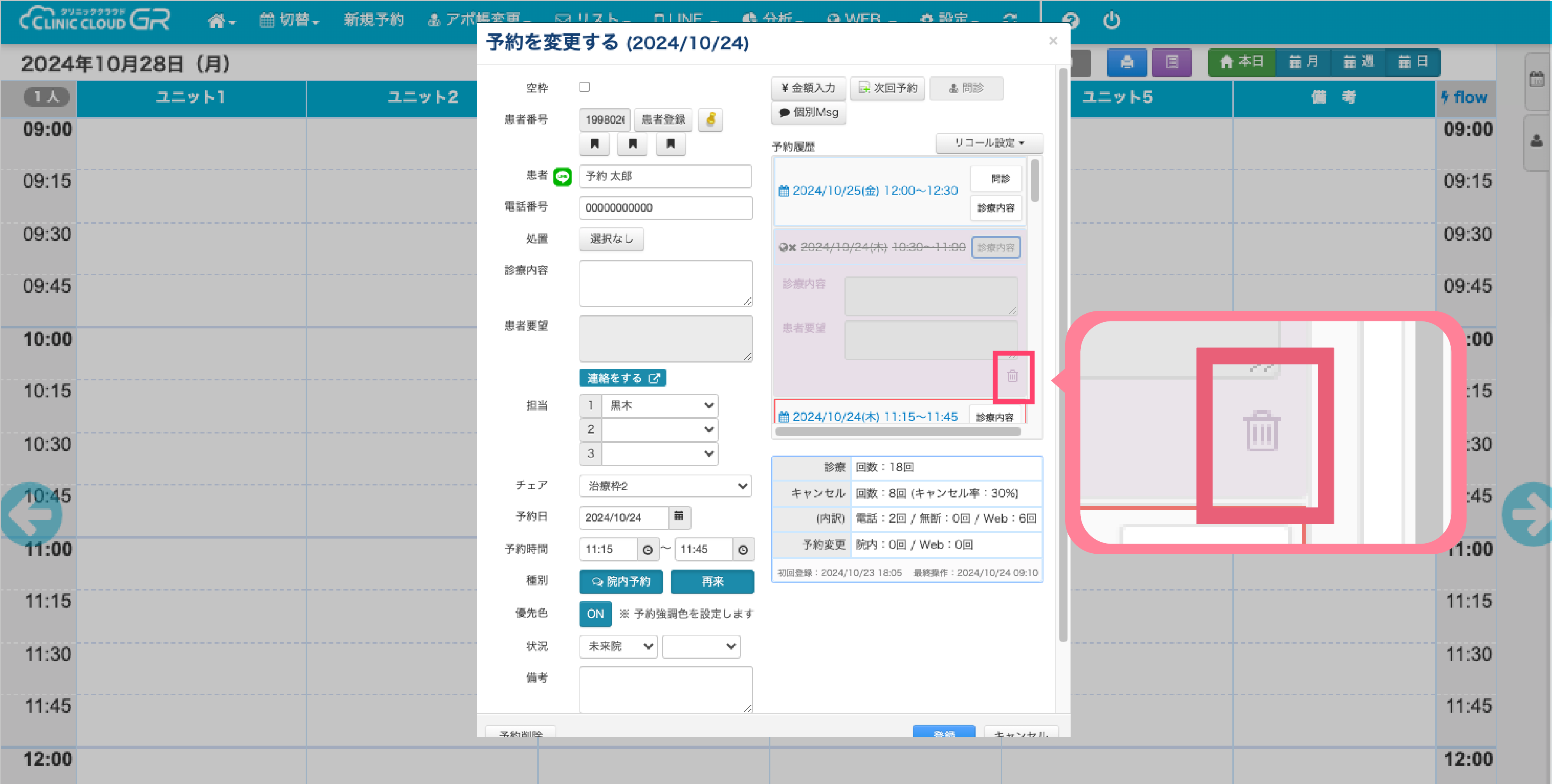 「予約詳細の履歴」機能アップデートのお知らせ 投稿日 2024年10月29日 ABOUT 「予約履歴」を削除できるようになりました。電話・無断キャンセルリストに誤って入れてしまった場合に修正ができます 1.履歴は、 「予約詳細」>「予約履歴」>「診療内容」 のゴミ箱のアイコンから削除ができます 2.「予約履歴」を削除すると統計データも修正されます 3.削除の履歴は 「設定」>「操作履歴」 から確認ができます ← 「問診票」アップデートのお知らせ → 「シフト管理」機能アップデートのお知らせ